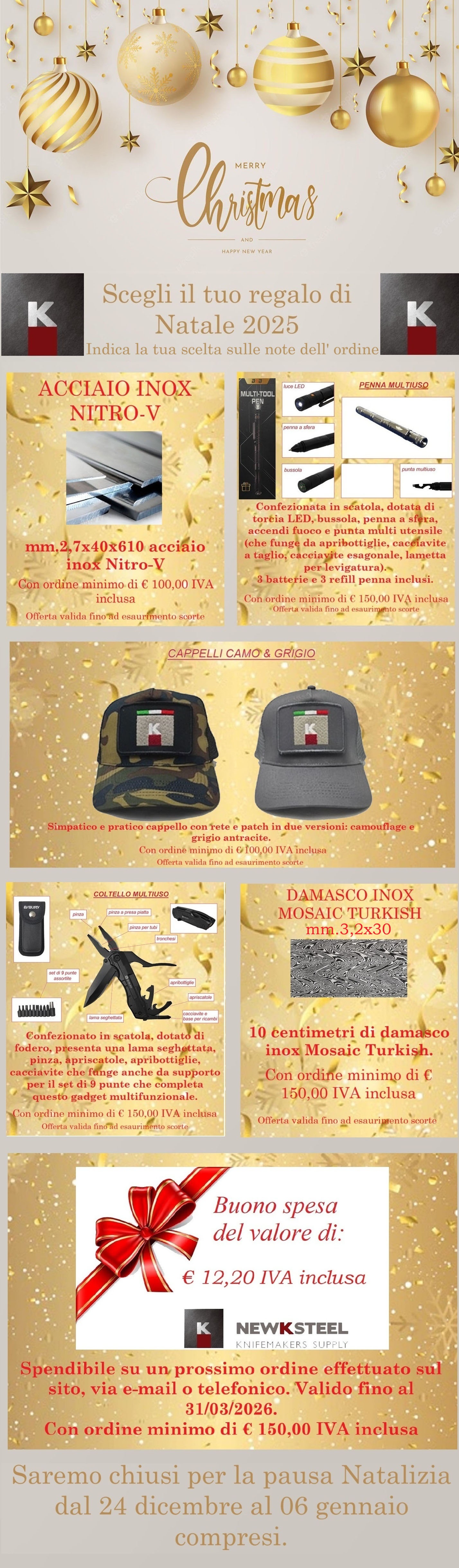 Prima della pausa Natalizia verranno evasi gli ordini con pagamento in bonifico bancario se ricevuti entro e non oltre martedì 16 dicembre, gli ordini con altre tipologie di pagamento se ricevuti entro e non oltre mercoledì 17 dicembre. Ricordiamo che in questo periodo i corrieri devono far fronte ad una mole di lavoro più alta del solito, quindi le consegne potrebbero subire alcuni ritardi. Gli ordini ricevuti durante la pausa Natalizia non potranno essere evasi con scontrino e verrano preparati e spediti alla riapertura a partire dal 7 gennaio 2026.